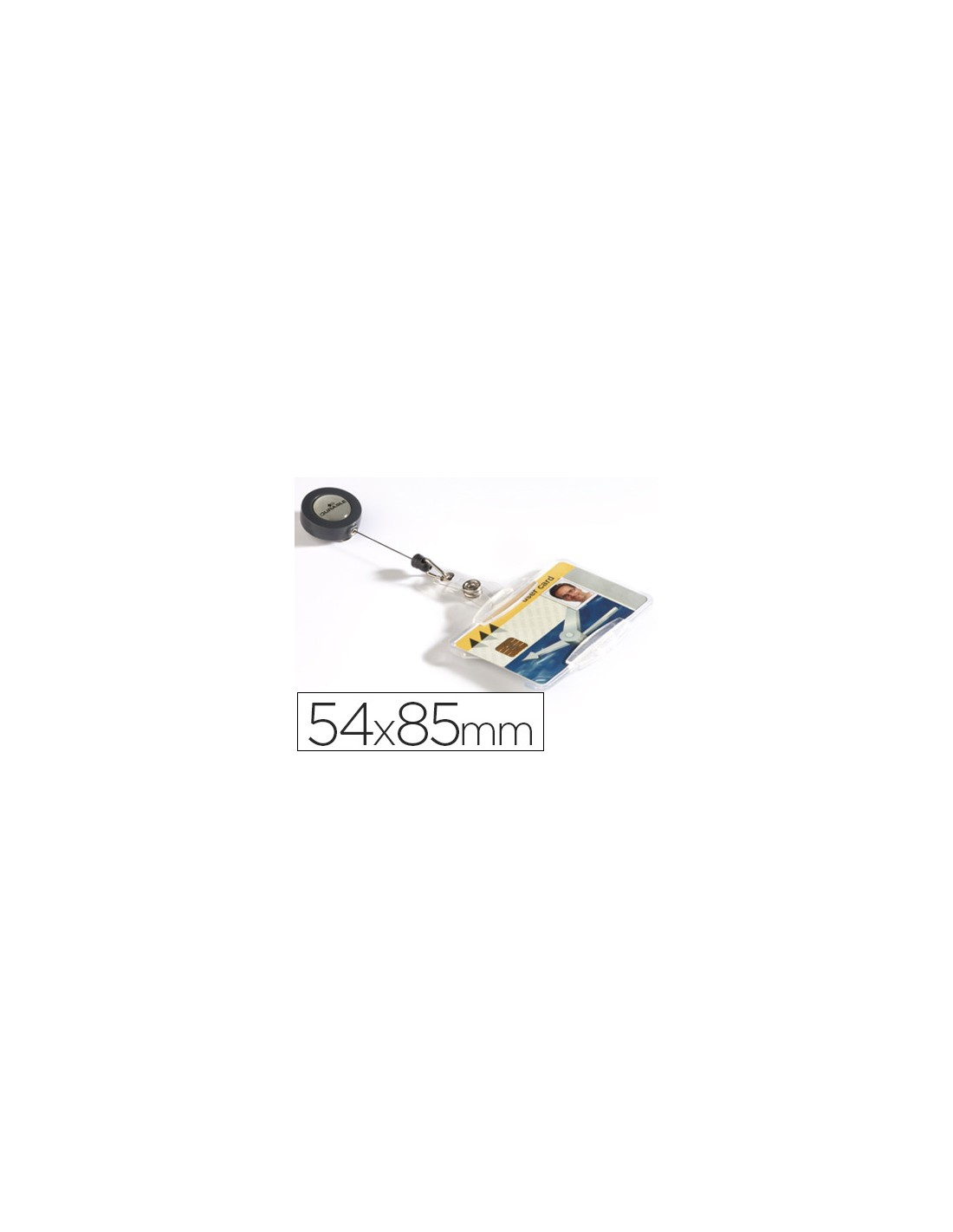 Identificador combinado con cordón extensible y pinza metálica en la parte posterior. Cierre de botón. Uso vertical y horizontal. Color transparente. Extensible hasta 800 mm. Medidas 54 x 85 mm.