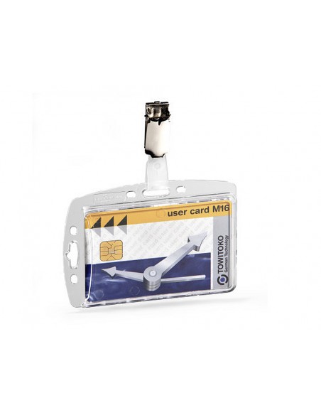 Identificador con pinza giratoria durable acrilico horizontal con uñero para pases de seguridad 54x85 mm