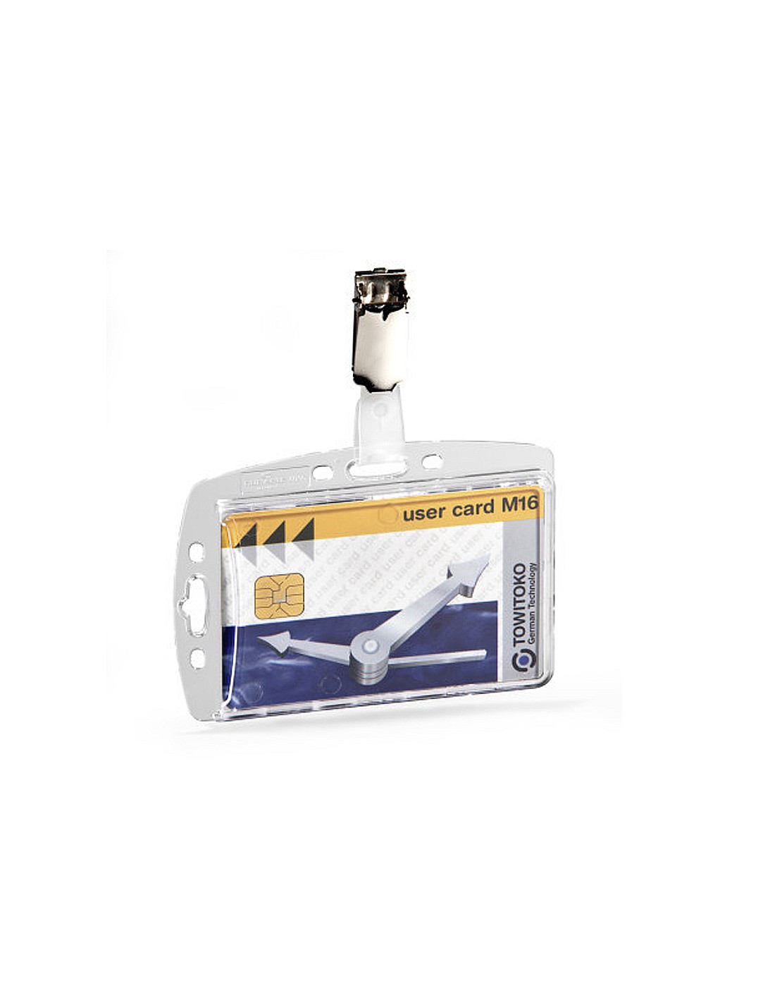Portanombres acrílico rígido para tarjetas de identificación o pases de seguridad. Con sujeción de pinza giratoria y uñero para extraer fácilmente la tarjeta. Puede combinarse con cadenas, cintas para portanombres y cordones extensibles.Color transparente. Medidas 54 x 85 mm.