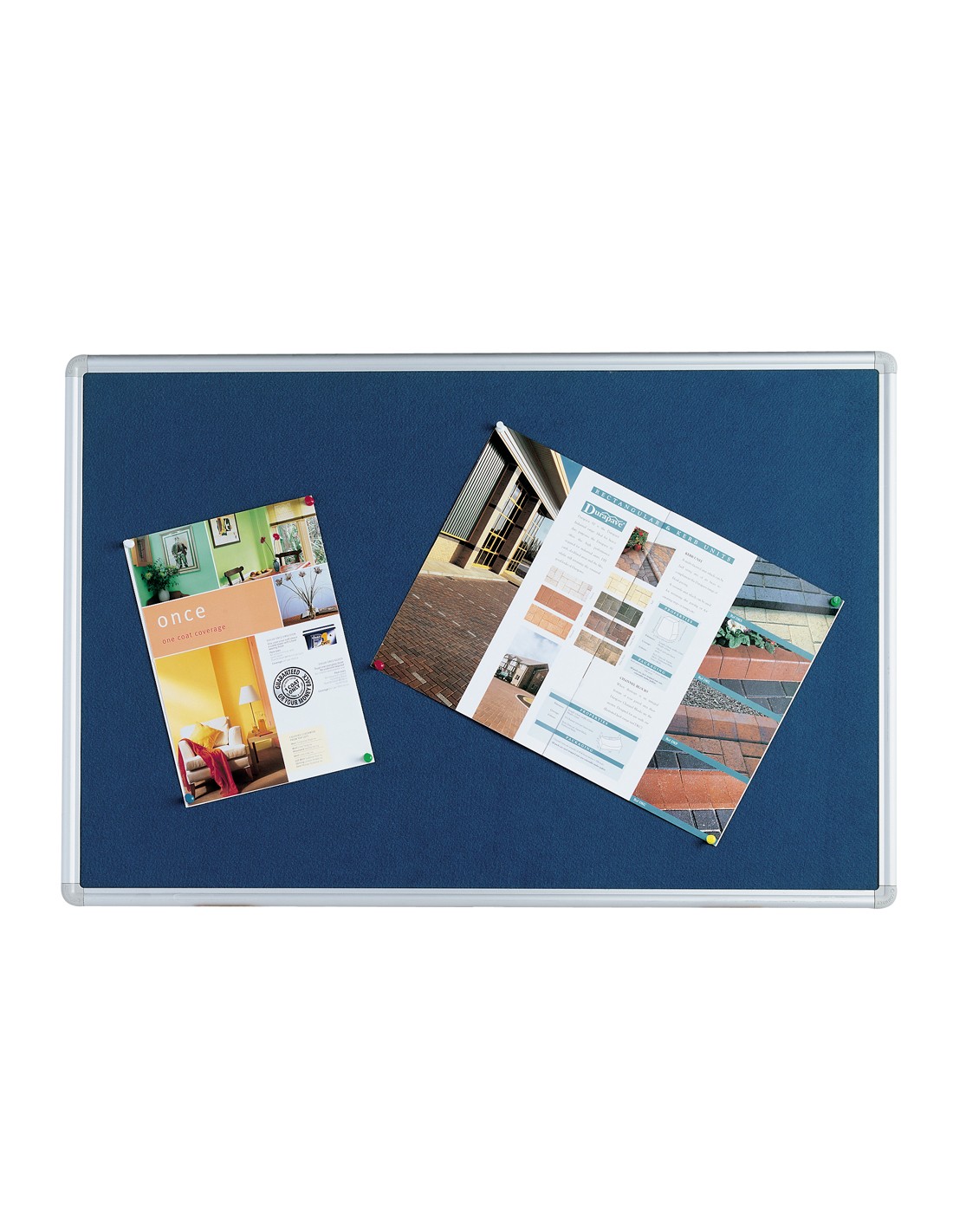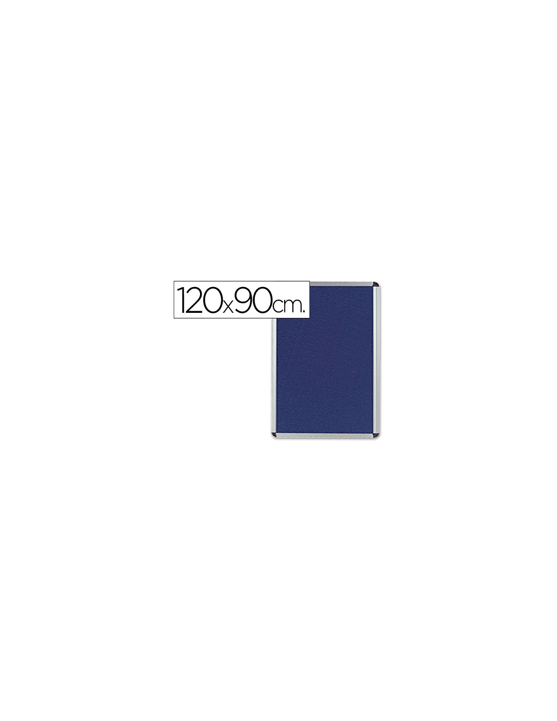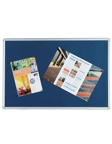 Con fondo azul, marco de aluminio y cantoneras redondeadas. Para uso en interiores. Fieltro resistente al fuego. Ideal para colgar publicidad, notas, avisos, pósteres, etc., mediante chinchetas o velcro. Provista de accesorios para su fijación a la pared. Fondo 3 cm. Capacidad (DIN A4) 15. Medidas 120 x 90 cm.