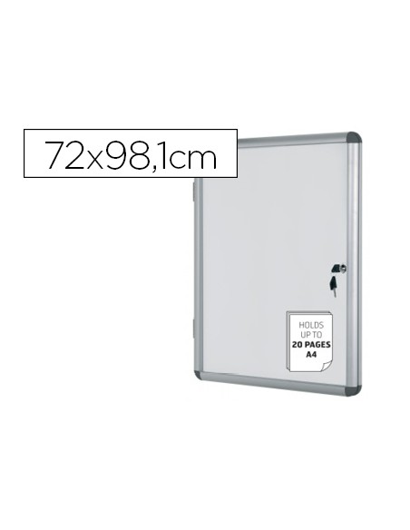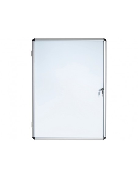 Vitrina de anuncios acristalada con marco de aluminio y superficie magnética de acero lacado en blanco. Cristal acrílico de alta transparencia que aporta gran visibilidad. Cantoneras redondeadas. Para utilizar con imanes y con rotuladores de borrado en seco. Incluye kit de fijación fácil. Cerradura con 2 llaves incluidas. Muy resistente, segura y ligera, con 3,5 cm de espesor.