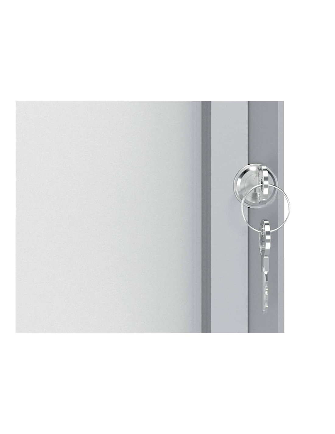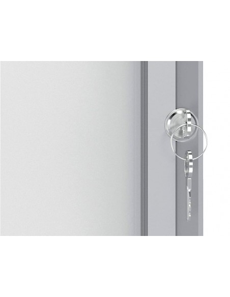 Vitrina con cerradura para interiores con superficie blanca magnética de borrado en seco y puerta de seguridad de cristal de 4 mm de grosor. Ideal para mostrar los documentos con seguridad. Optimizada para diversas hojas formato DIN A4. Bisagras laterales. Se suministra con los anclajes a la pared y dos llaves. Medidas 4 × A4. Medidas externas 532×692×37 mm.