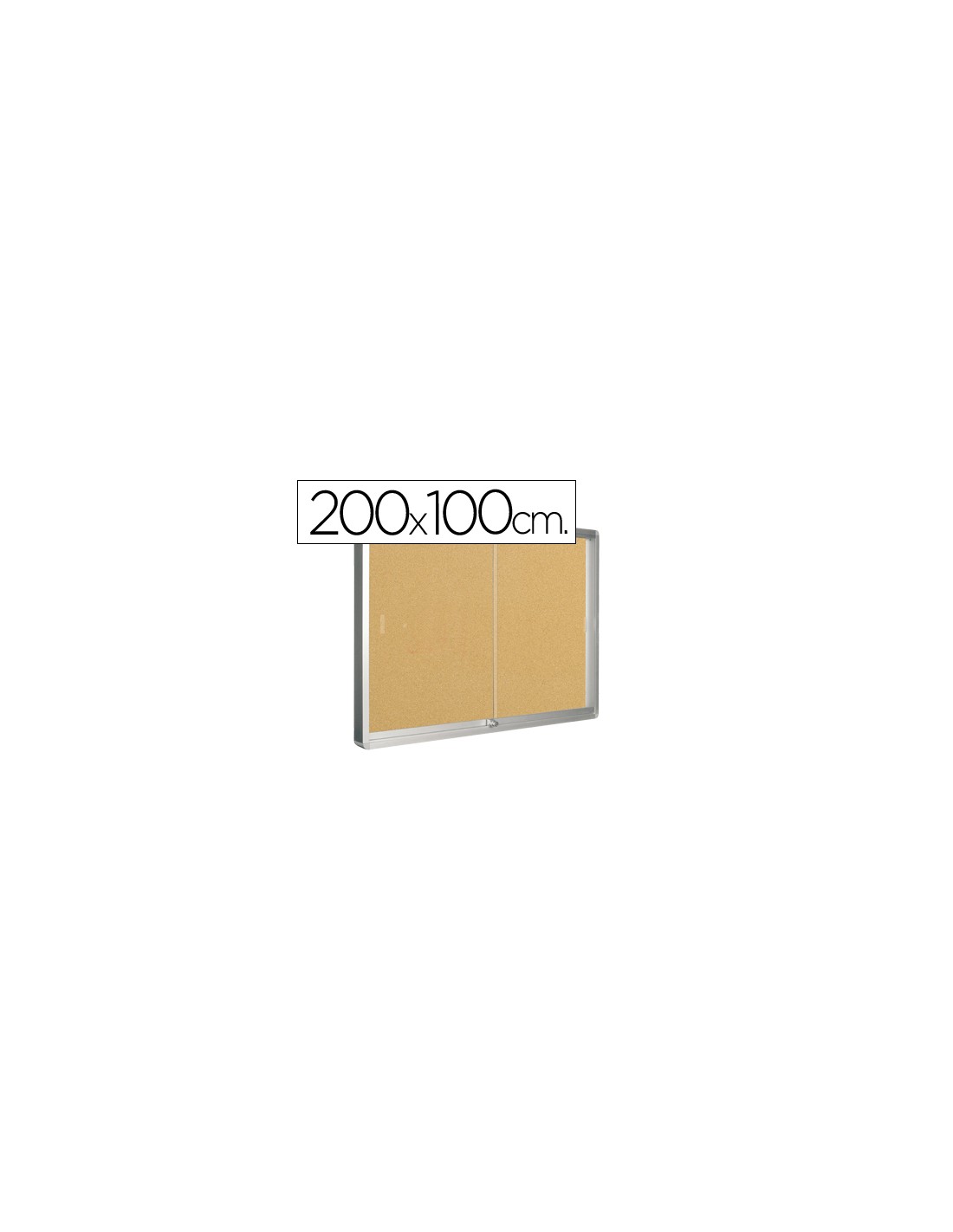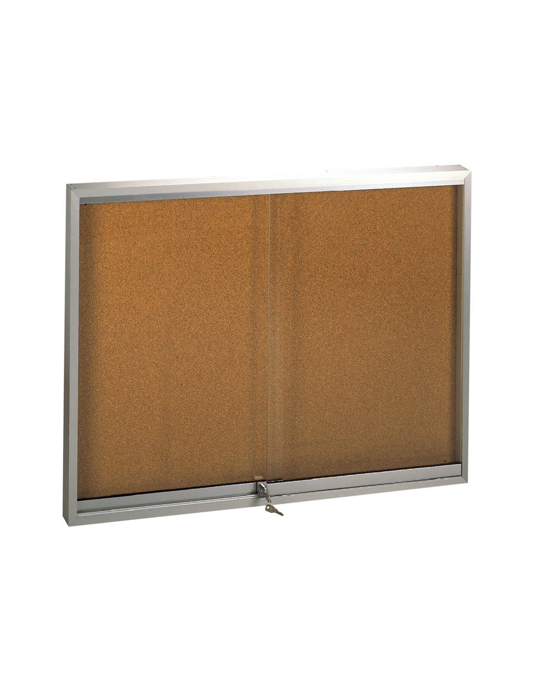 Con fondo de corcho, construida en aluminio anodizado. Puertas correderas de cristal de seguridad antirroturas de 5 mm de grosor y cerradura con 2 llaves. Provista de accesorios de fijación a la pared. Cantoneras redondeadas. Puerta de cristal. Fondo 6 cm.