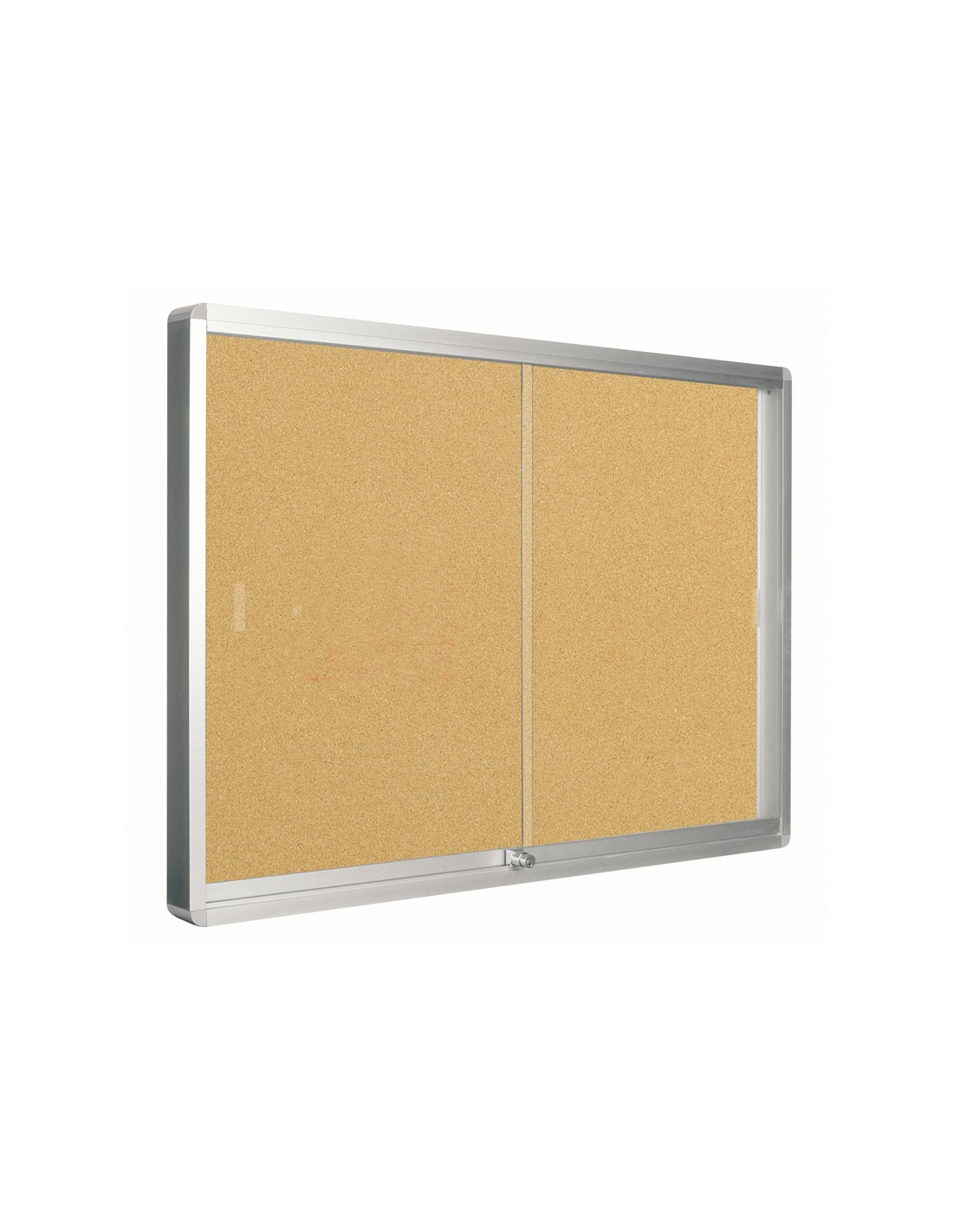 Con fondo de corcho, construida en aluminio anodizado. Puertas correderas de cristal de seguridad antirroturas de 5 mm de grosor y cerradura con 2 llaves. Provista de accesorios de fijación a la pared. Cantoneras redondeadas. Puerta de cristal. Fondo 6 cm.