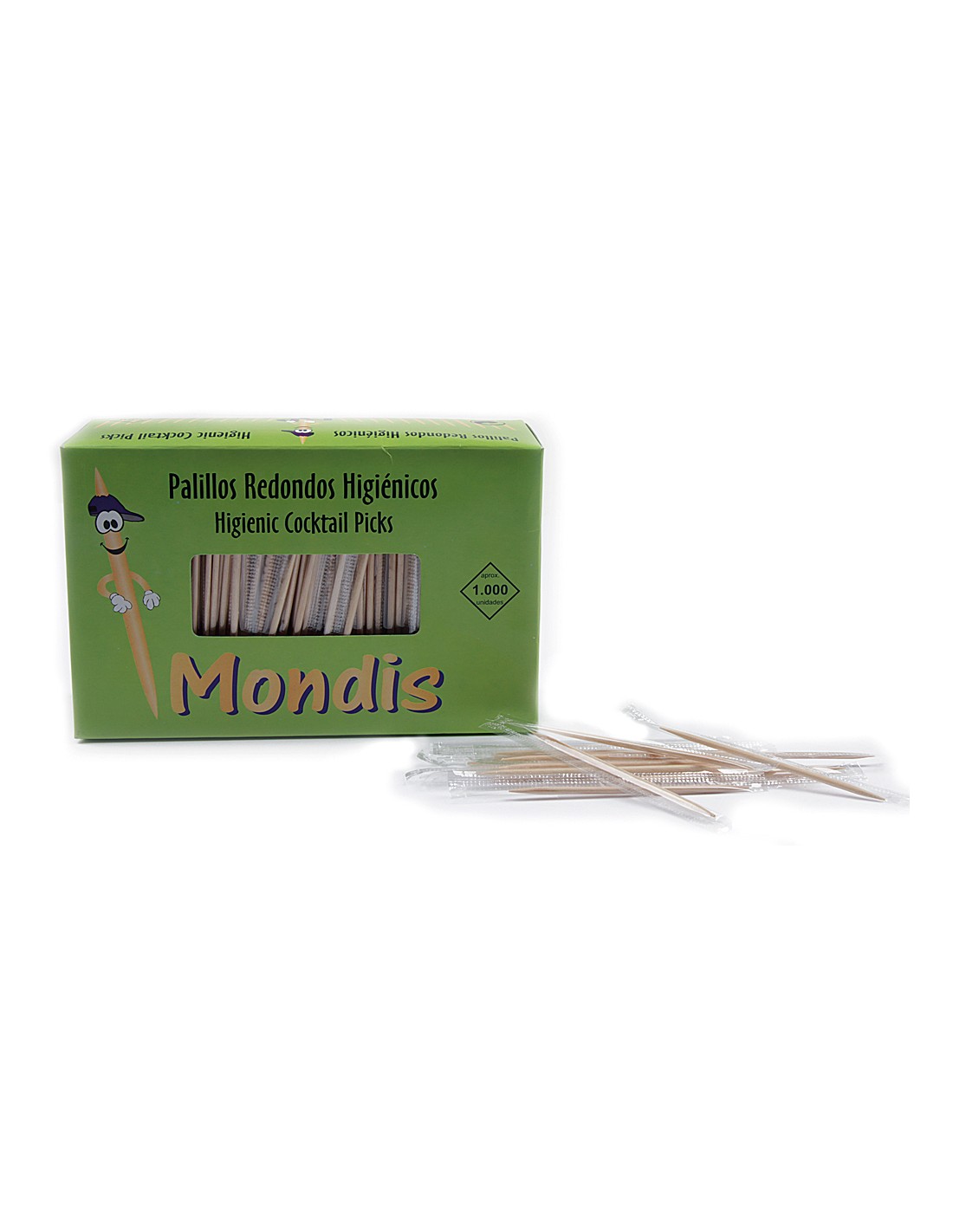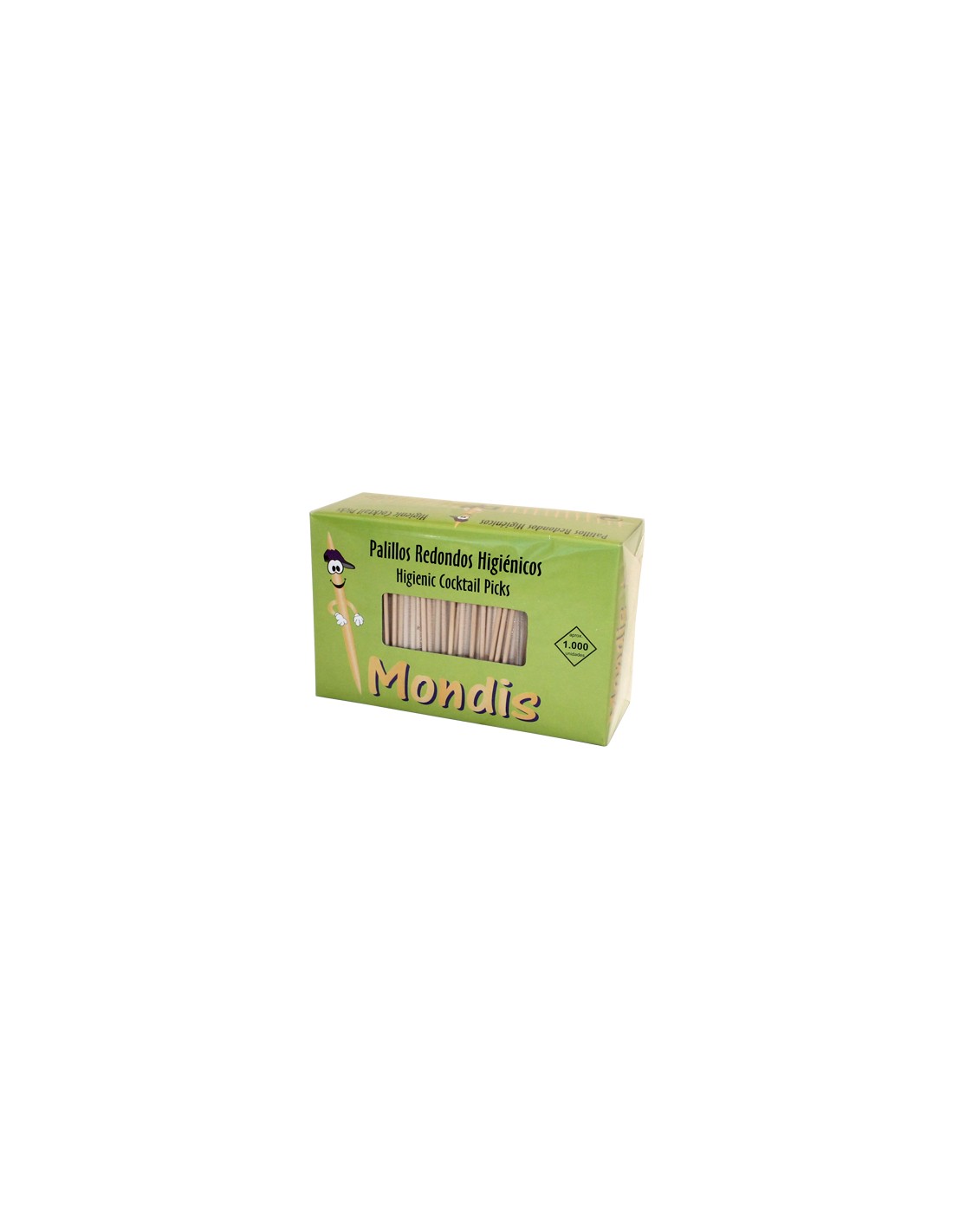 Palillos de dientes enfundados individualmente en papel celofán. Forma redonda. Fabricados en madera. Totalmente higiénicos. La caja de 1000 unidades.