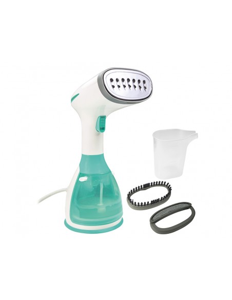 Plancha a vapor vertical. Sistema antigoteo. Perfecta para planchar prendas directamente en la percha. Botón de vapor continuo (25 gr/min). Indicador luminoso de encendido. Accesorios extraíbles cepillo para ropa delicada y quita pelusas. Calentamiento rápido en 45 segundos. 1500 w. Depósito de 280 ml. Medidas 170 x 290 x 120 mm.