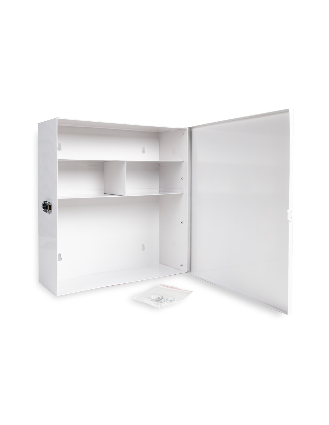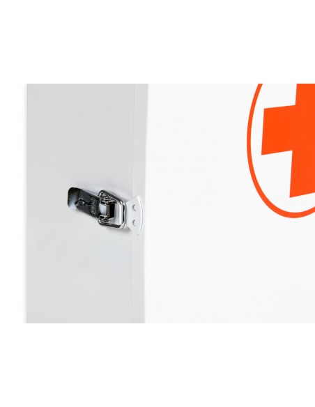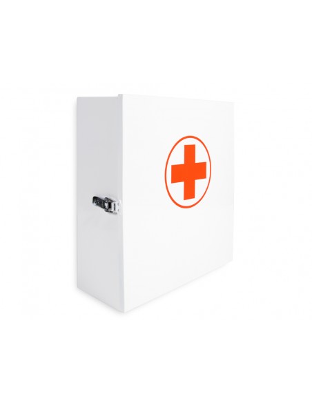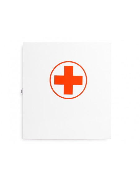 Armario fabricado en acero. Con 4 compartimentos interiores para mantener las medicinas y los utensilios de primeros auxilios organizados. Ideal para el hogar o la oficina. Con cierre metálico. No incluye ningún tipo de material de primeros auxilios. Incluye tornillos para fijar a la pared. Color blanco y rojo. Medidas 330 x 360 x 120 mm.