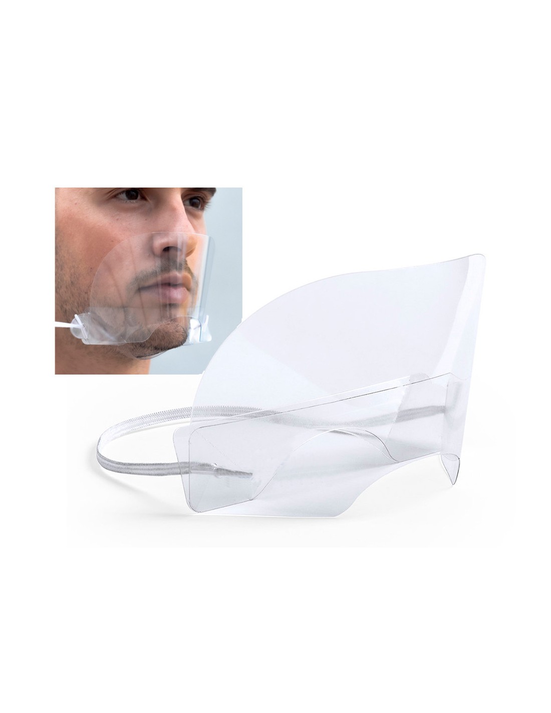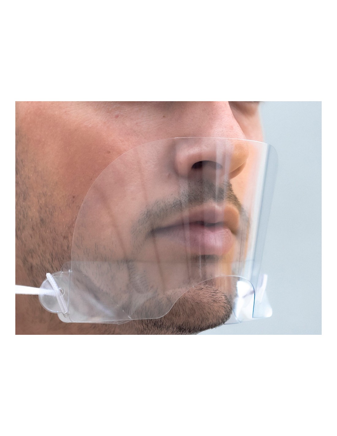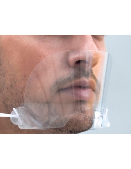 Pantalla buconasal en resistente material PET, con protector para barbilla y cómodo elástico de ajuste para la cabeza. Proporciona aislamiento frente a salpicaduras y partículas en zonas especialmente sensibles, como el área de la nariz y la boca. Fácil de desinfectar después de cada uso y especialmente diseñado para situaciones en las que resulta necesario que la boca resulte visible (reuniones, lectura de labios por sordomudos). Fabricada con materiales aptos para el contacto con la piel, con terminaciones diseñadas para un uso prolongado, sin provocar incomodidad o irritaciones. De fácil montaje. Medidas 170 x 85 mm.