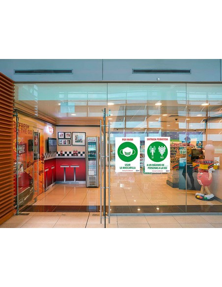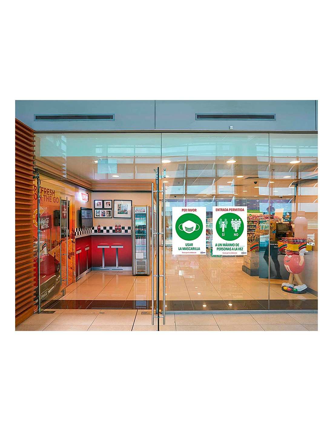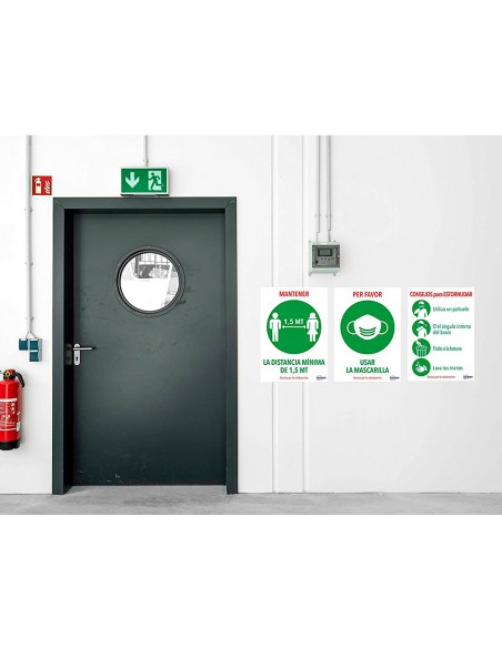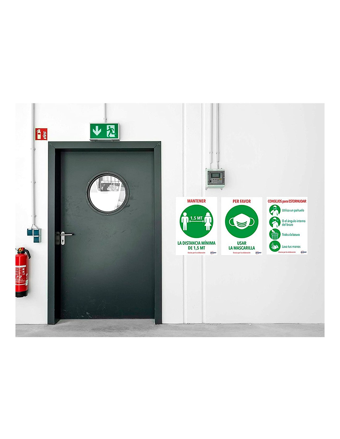 Carteles de poliéster con adhesivo permanente. Preimpresos, resistentes y listos para el uso. Ideales para comunicar los mensajes principales de forma rápida y sencilla para evitar la propagación del virus. Se pueden aplicar sobre vidrio, metal y plástico. Adhesivo permanente. Formato DIN A4.