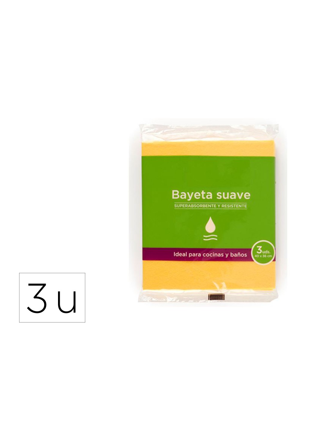 Bayetas amarillas suaves. Composición 70% Viscosa 15% Poliéster 15% Polipropileno. Peso tejido 150 g/m². Medidas bayeta 40x36 cm. Color amarillo. Pack de 3 unidades.