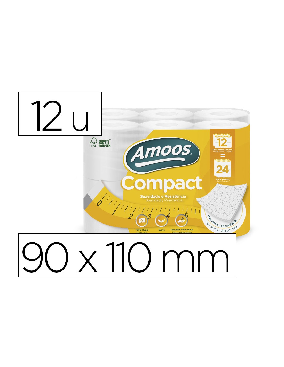 Papel higiénico Amoos Compact. 2 capas. 30g/m².Paquete de 12 rollos.