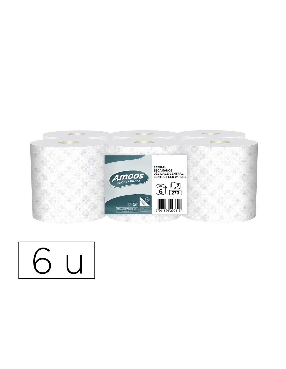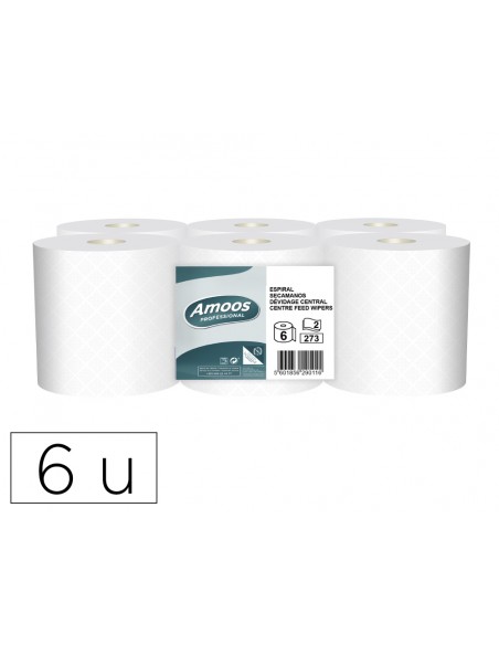 Papel secamanos Amoos Industrial. 2 capas. 32g/m². Paquete de 6 rollos.