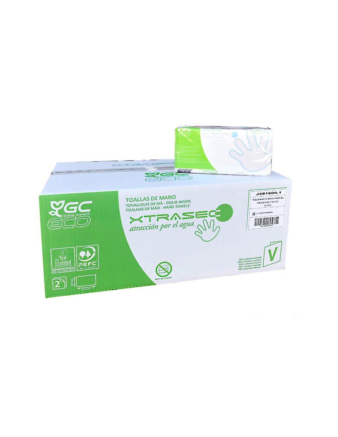Con exclusivo encolado de capas que le aporta un extra de suavidad, comodidad y resistencia. Empaquetado 100% cerrado que garantiza la máxima higiene y asepsia.RECICLADA. Plegado V. 2 capas. Medidas 200 x 230 mm. Gramaje 19,5 g/m². El paquete de 196 toallas engarzadas.