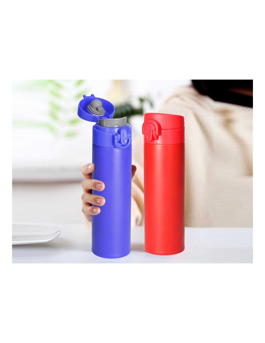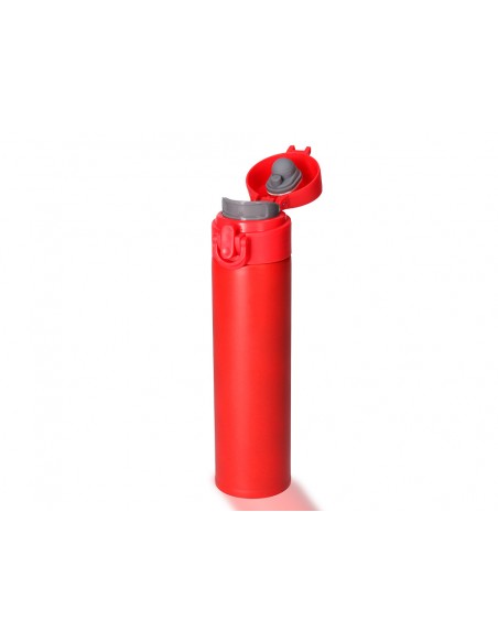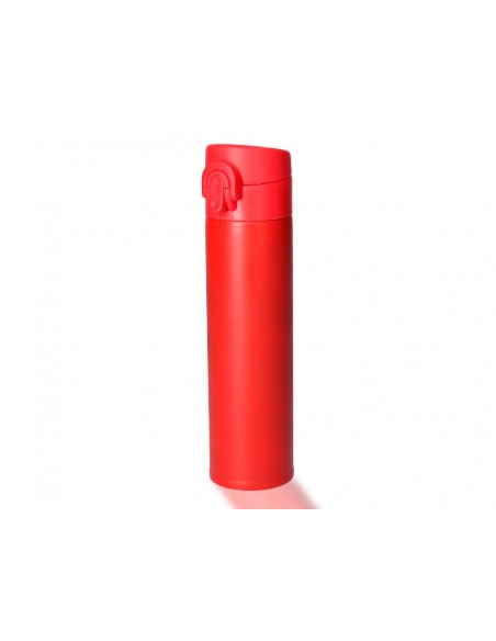 Termo en acero inoxidable de 330 ml de capacidad. Con doble cobertura para mejor y más duradera conservación de la temperatura y con sistema de apertura fácil con botón. Disponible en rojo y azul. Presentado en atractiva caja de diseño.