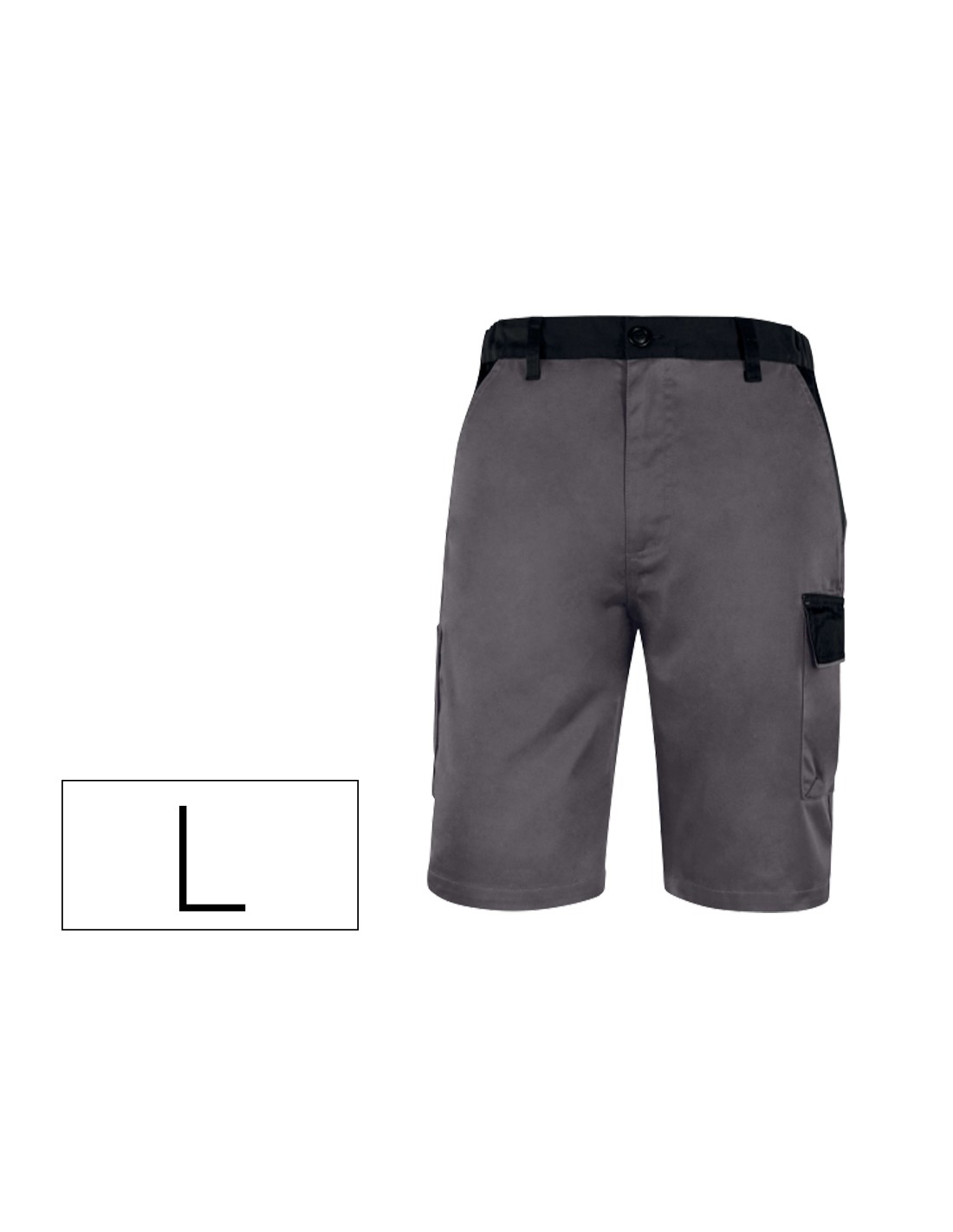 Pantalon de trabajo deltaplus bermuda cintura ajustable 5 bolsillos color gris. Talla L. Tejido 65% poliéster y 35% algodón de 235 g/m². Cintura ajustada por elástico. 5 bolsillos.